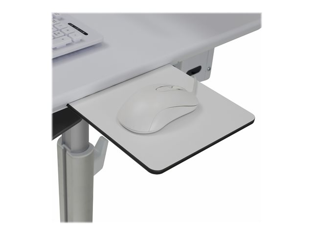 - Offers a retractable mouse shelf that easily pulls out on the left or right and then stows away under the worksurface when not in use